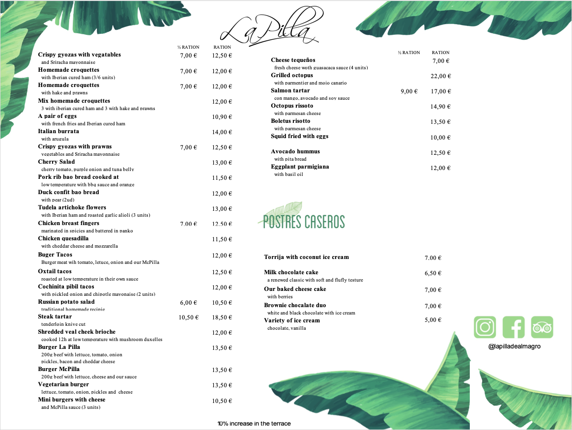 Tenemos además sugerencias fuera de carta los fines de semana de jueves a sabádo. Y por supuesto, si vienes a tomar el aperitivo a La Pilla, te pondremos una tapa de cortesía para que pruebes nuestra cocina.